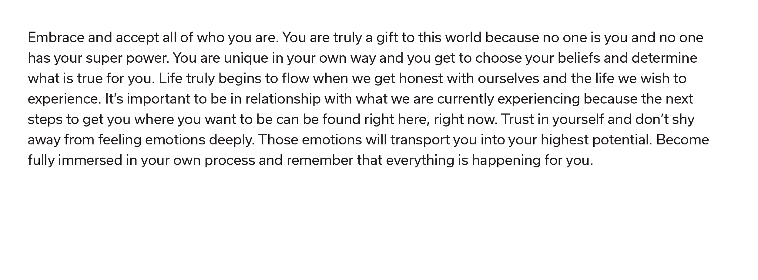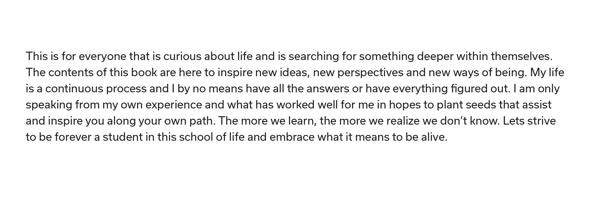 A book for everyone, especially for those that are doing the internal work to truly transform their lives and assist opening the minds to those who’d like to begin. With the additions of my own personal creations, this book was created to inspire you and ignite passion for being alive. To challenge you to see things from a new perspective and to use your mind in ways that you may not have seen before. This book is here to act as a reminder that there is no right or wrong way to be you and that your life is your process and you hold the power over your reality. Take what resonates and leave the rest. Through my own life lessons and experiences, this is my gift to you.